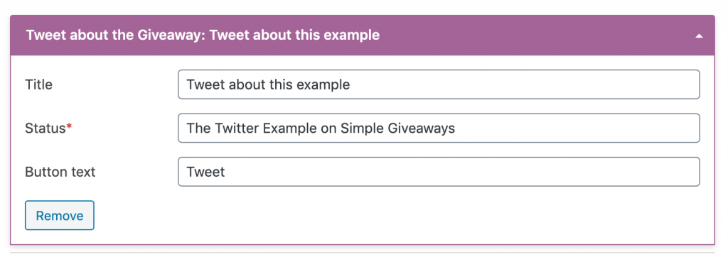 The Tweet action called “Tweet about the Giveaway” can be used for users to tweet about your giveaway on their Twitter Profile.